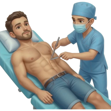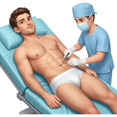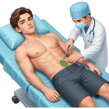 A guy about 23 years old, handsome, full-length, completely naked, has six-pack abs, his genitals are covered by a leaf , He has natural body hair on his arms, legs, and a faint line of hair below his navel. He lies in operating table . The surgeon uses a scalpel to make a cut in guy stomach. emoji