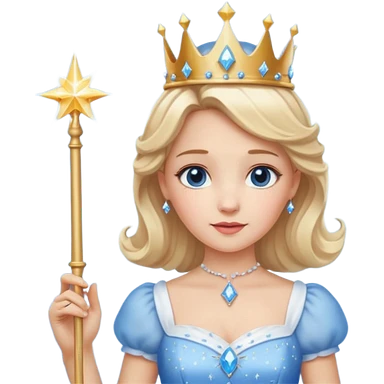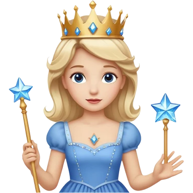 dorothy queen blonde hair, white dress with magic wand, rounded sparcle, and crown on head.Decolded blue dress emoji