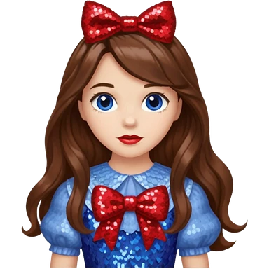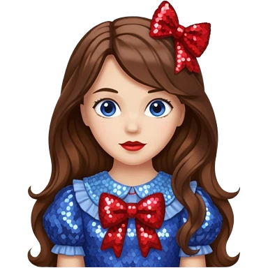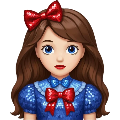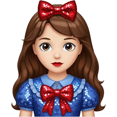Dorothy Gale from the Wizard of Oz with long brown hair, periwinkle sequin outfit, red sequin bow emoji