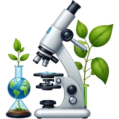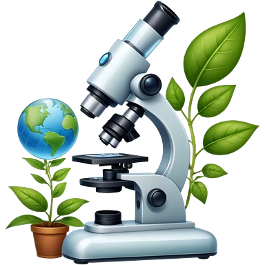An icon featuring a microscope, a DNA strand, and plant leaves, symbolizing biology. The design includes cells, a test tube with a plant sample, and a globe, representing life sciences, ecosystems, and the study of organisms. Transparent background highlights the exploration of living systems. emoji