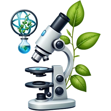 An icon featuring a microscope, a DNA strand, and plant leaves, symbolizing biology. The design includes cells, a test tube with a plant sample, representing life sciences, ecosystems, and the study of organisms. Transparent background highlights the exploration of living systems. emoji