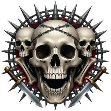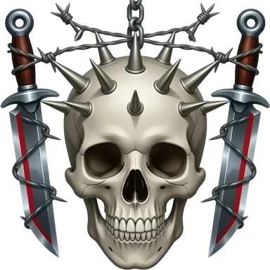 Hanging skulls, bones, teeth, spikes, barbed wire, blades edgy gothic black red silvery grey cool steel greyish dusky cold emoji