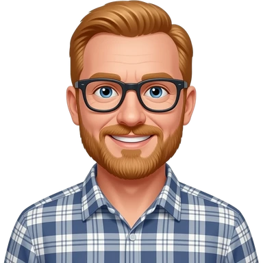 middle-aged white man with short ginger hair. blue eyes. beard. glasses. smiling. wearing a plaid collared shirt. emoji