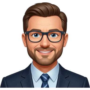 middle-aged white man with short brown hair. blue eyes. beard. glasses. smiling. wearing a suit. emoji