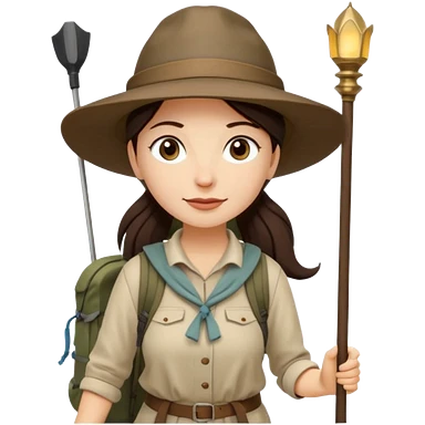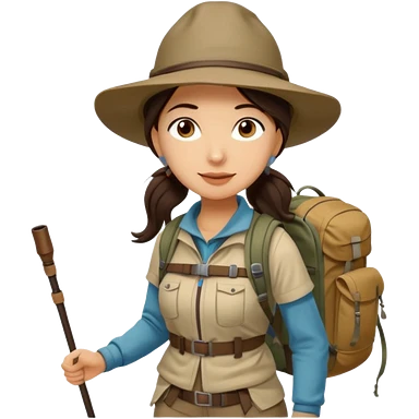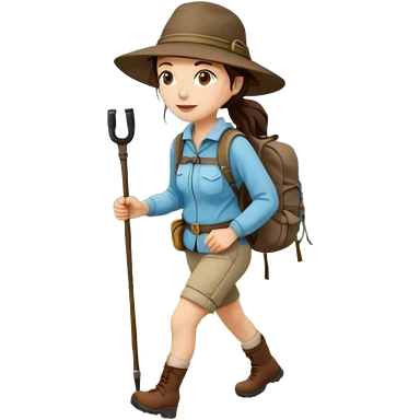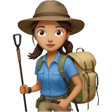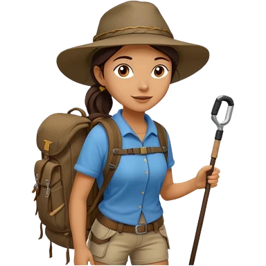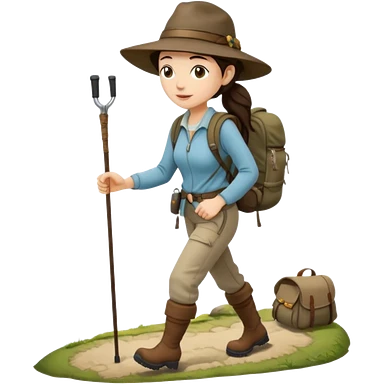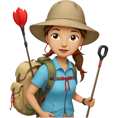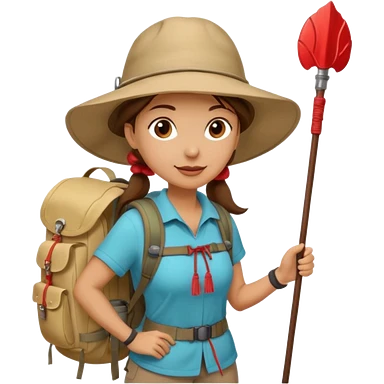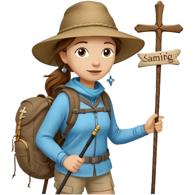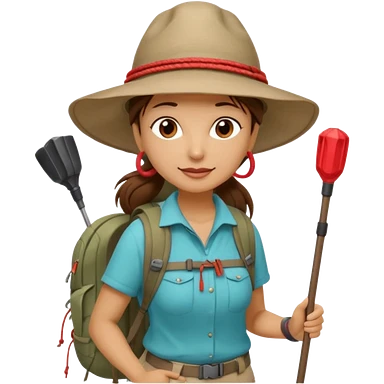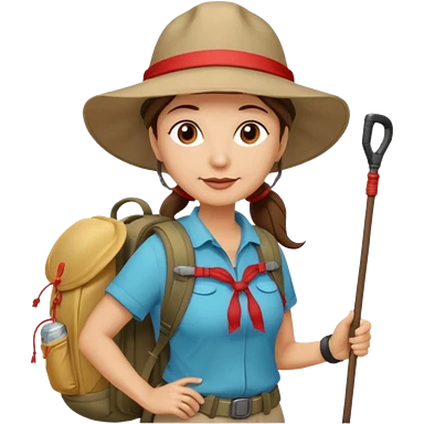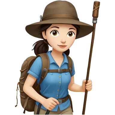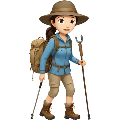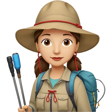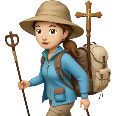 Middle aged women, long brown ponytail with wide brim hiking hat. With backpack and trekking poles. Backpack has a scallop shell with the cross of saint james hanging from it. Remove the cross and add a scallop shell on a red string hanging from the backpack emoji