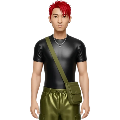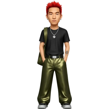 Mike Shinoda with red hair, black metallic shirt, olive metallic baggy pants, silver necklace emoji