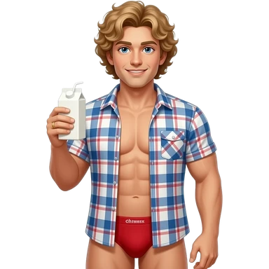 Sexy blond curly haired muscle man ingreen plaid shirt and blue thong holding milk carton with gold band on finger emoji