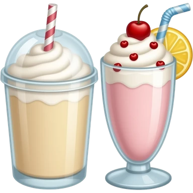 Milkshake vanilla with a banana sticking out of the milk shake it and two strawberries on both sides of the banana at the very tip of the banana, whipped cream and a smiley face one big banana coming out of milk shake emoji