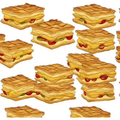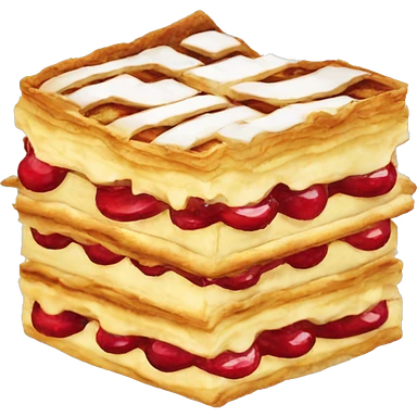 Cinematic delicate mille-feuille, thin crispy pastry layers filled with smooth vanilla cream, dusted with powdered sugar, elegant presentation, highly detailed and sophisticated. emoji