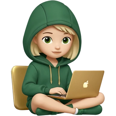 3D clay render character sitting with laptop, rounded cute design, deep green (#0B3D2C) hoodie, cream laptop, gold accents, Pixar style, transparent background emoji