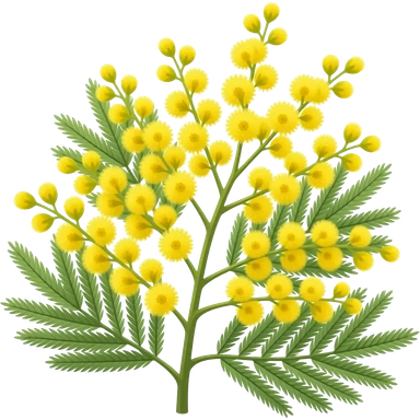 mimosa blossom cluster, round fluffy yellow flowers with tiny filaments, slender green stems, delicate feathery leaves, vibrant and soft spring bloom, no vase or extras, apple emoji style, soft lighting, transparent background, emoji scale emoji