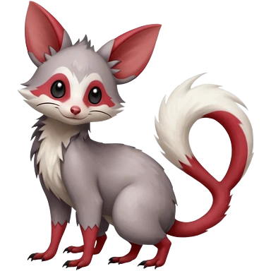 Minccino-Opossum-Lykoi-Zangoose-fusion-hybrid-animal-Fakémon-creature, full body, thin long sleek scaly tail, intricate markings emoji