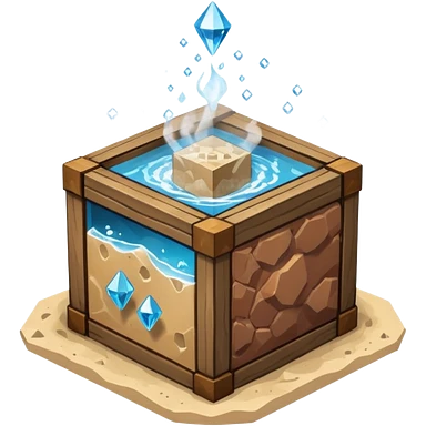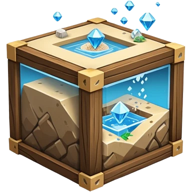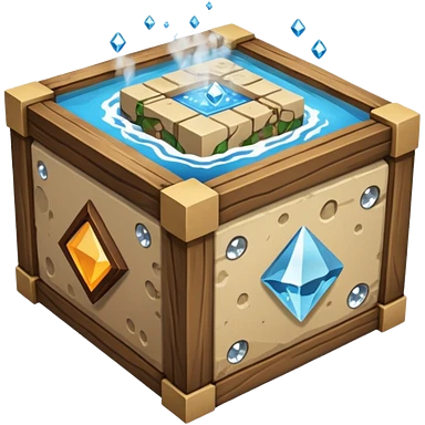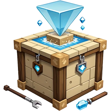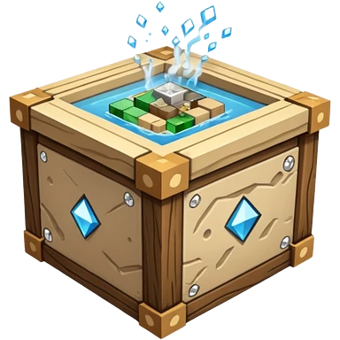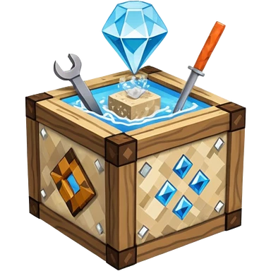 crafting table with tools, stone, wood, glass, sand, steam, water, diamonds... like a minecraft style cube crafting table emoji