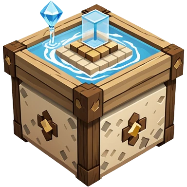 crafting table with tools, stone, wood, glass, sand, steam, water... like a minecraft style cube crafting table 100% like a minecraft table crafting, with on the right, left, a glass showing crafting merging between stone and wood emoji