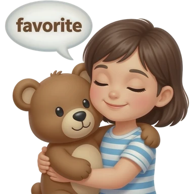 a KID hugging a teddy bear and there is a conversation bubble above her with the word "favorite" emoji