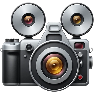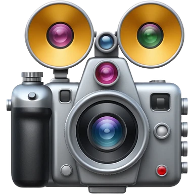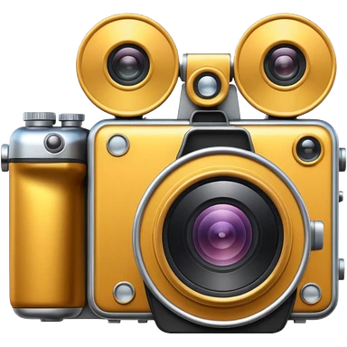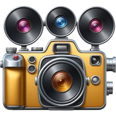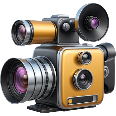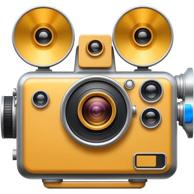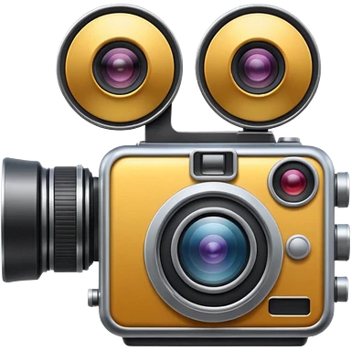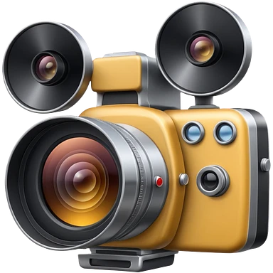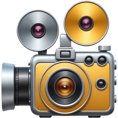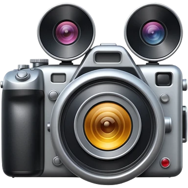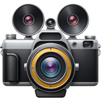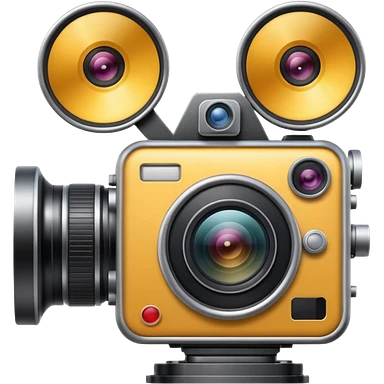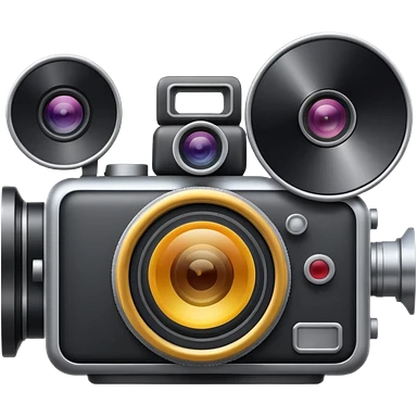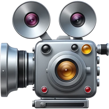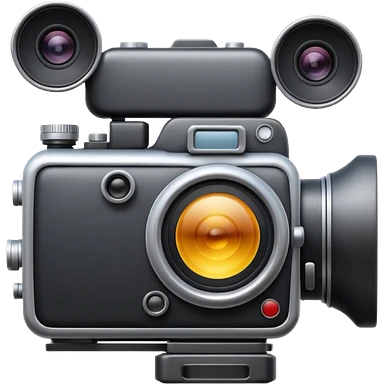 Minimal emoji icon of a huge cinematic metalic camera, front view, simple shapes, realistic lens, emoji