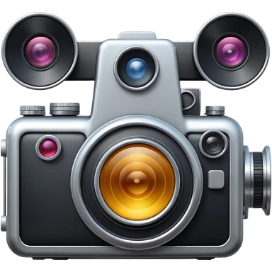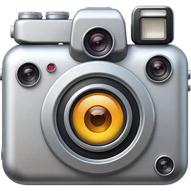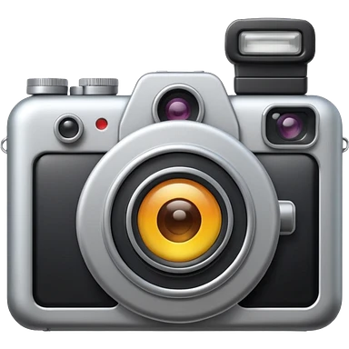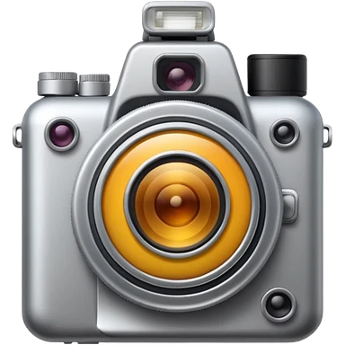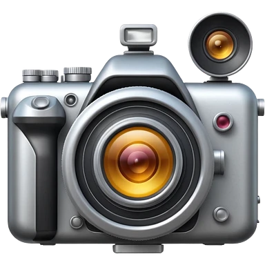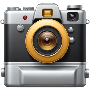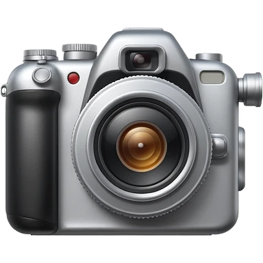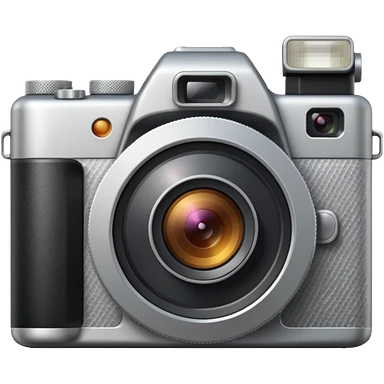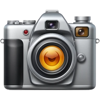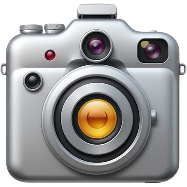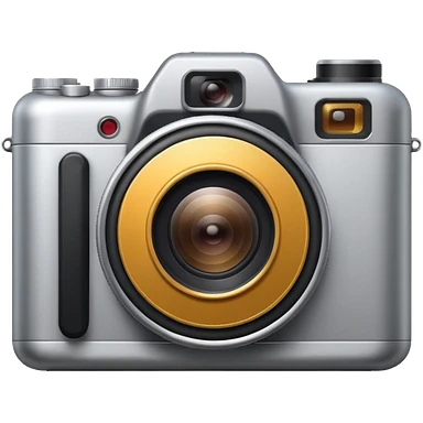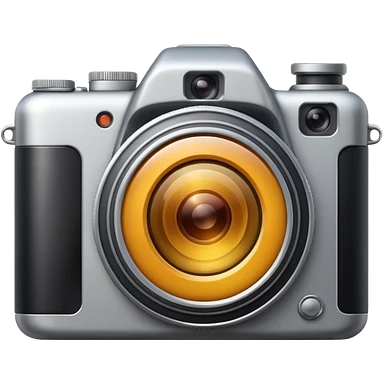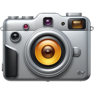 Minimal emoji icon of a modern metalic camera, front view, simple shapes, realistic lens, emoji