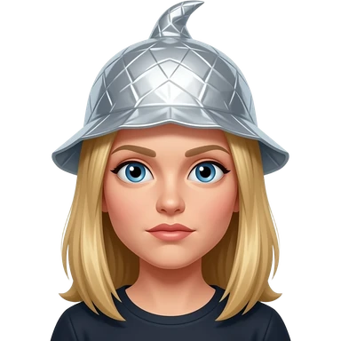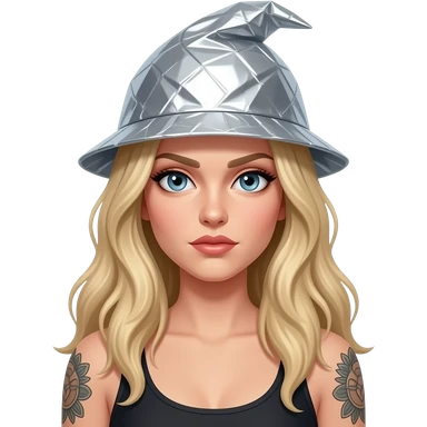 Small aluminum foil top hat conspiracy on blond woman long hair with arm tattoos emoji