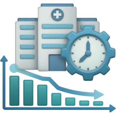 Minimalist flat icon of a clean hospital building integrated with a dynamic gear and clock symbol. Below it, a graph shows a declining line, representing reduced patient wait times. Tech blue and teal colors, professional medical vector art style, clean white background. emoji
