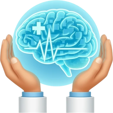 Minimalist flat icon of a glowing digital brain held by doctor's hands, medical cross and heartbeat symbols, AI in medicine concept, tech blue and white colors, vector art style, clean background. emoji
