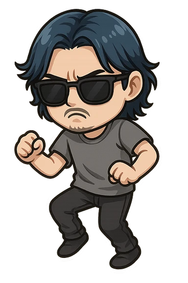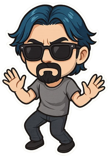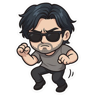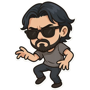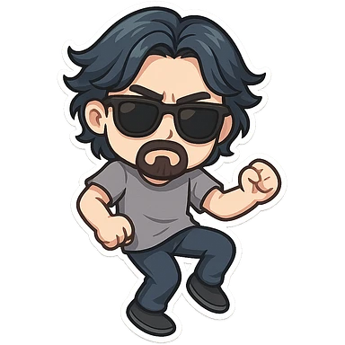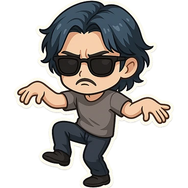 a dark brooding hipster with electric dark blue hair, surfer middle part, chin length hair, classic neat trimmed bushy goatee, black classic rayban shades, plain gray t-shirt, doing the shuffle dance, step shuffle tiktok dance, 1980's dance emoji