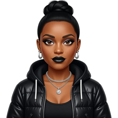 Missy Elliott with dark brown eyes, black updo hair, black eyeshadow and lipstick, black metallic hip-hop outfit, necklace and earrings emoji