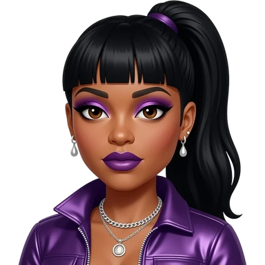 Missy Elliott with dark brown eyes, black high ponytail bang hair, dark purple eyeshadow and lipstick, dark purple metallic hip-hop outfit, necklace and earrings emoji