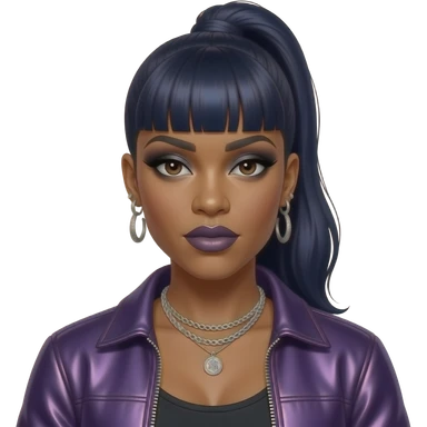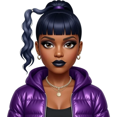 Missy Elliott with dark brown eyes, dark indigo high ponytail bang hair, black eyeshadow and lipstick, dark purple metallic hip-hop outfit, necklace and earrings emoji