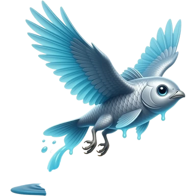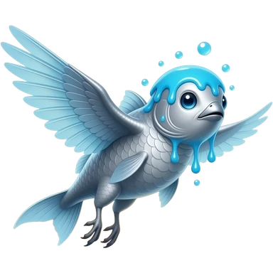 Mistfin A silver fish-bird hybrid made of blue goo, slime head, bubbles that leaps above lakes at sunrise and leaves a cool mist behind it. Its wings look like translucent fins. emoji