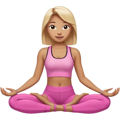 Mujer color de piel moreno claro con cabello rubio suelto y lacio, que tenga gloss en los labios y se vea usando Blush rosita, usando un top rosa deportivo y leggins deportivo rosa en una pose de yoga, viendo hacia enfrente con ojos negros y sonriendo sin mostrar los dientes emoji