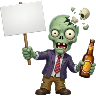 зомбі тримає білу табличку в правій руці, а пляшку пива в лівій, череп розбитий в нього випадають міски emoji