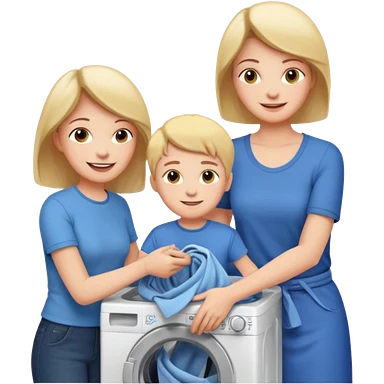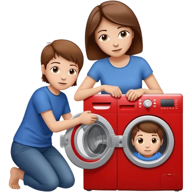 Mother and little son with brown hair putting clothes in the washing machine emoji