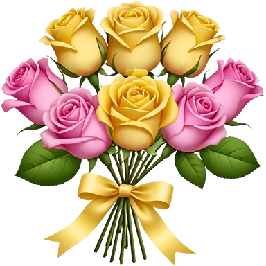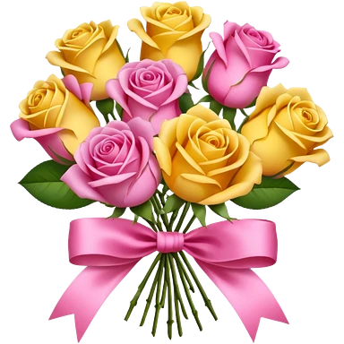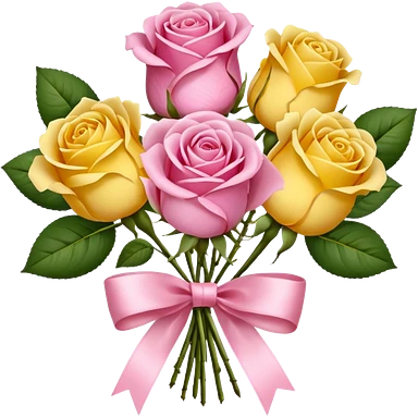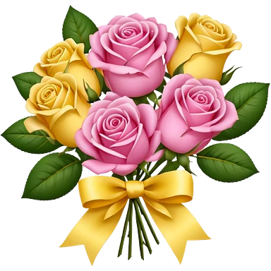 A bouquet of flowers, composed of pink and yellow roses, four blooms in total, tied with ribbon. emoji