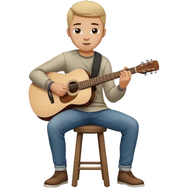 Young man – sitting on stool, casual clothes, playing acoustic guitar, focused expression. emoji