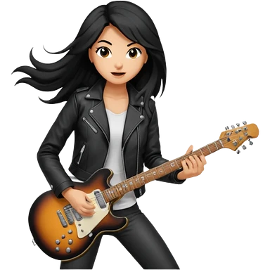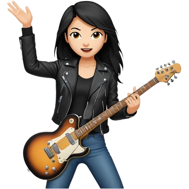 Young woman – standing on stage, leather jacket, playing electric guitar, energetic pose emoji