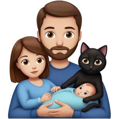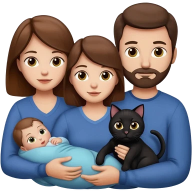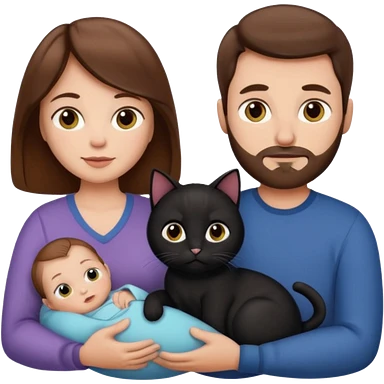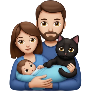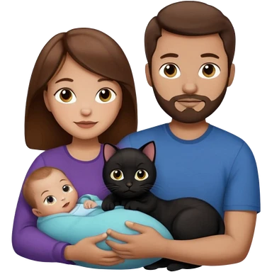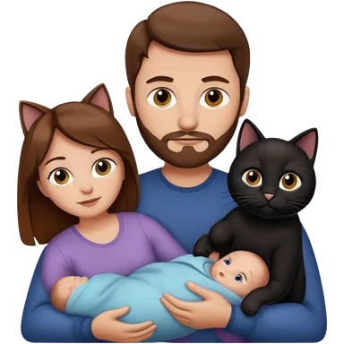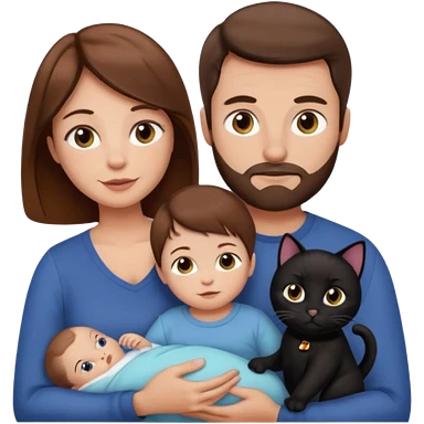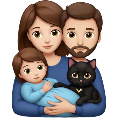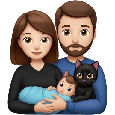 1 mom brown hair, 1 dad no beard, 1 baby and 1 black cat emoji
