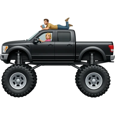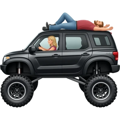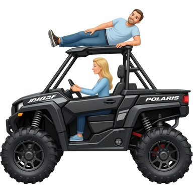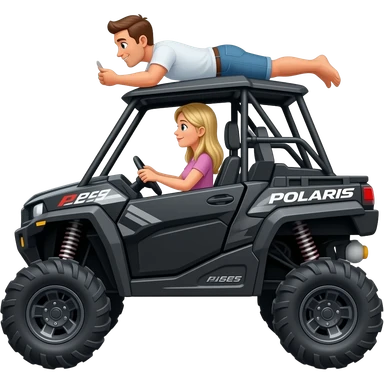 Black side view Polaris ranger sxs lifted super high with mom (blonde) and driving and dad laying on top of roof emoji