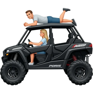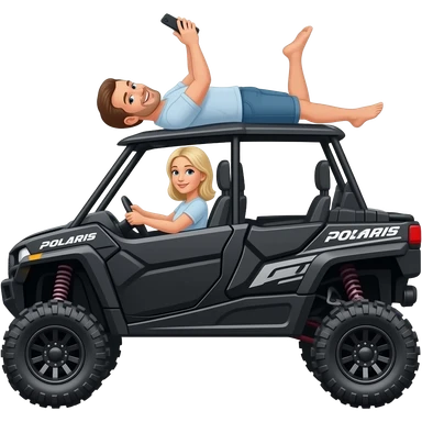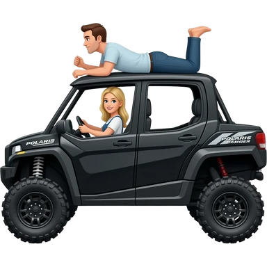 Black side view Polaris ranger sxs lifted super high with mom (blonde) and driving and dad laying on top of roof on his belly playing emoji