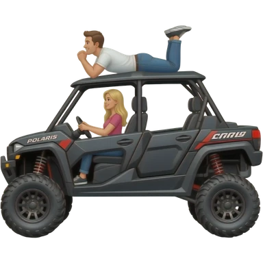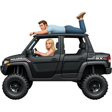 Black side view sxs 4 door Polaris ranger sxs lifted super high with mom (blonde) and driving and dad laying on top of roof on his belly playing emoji