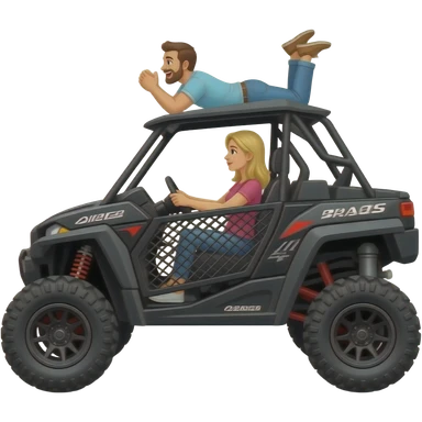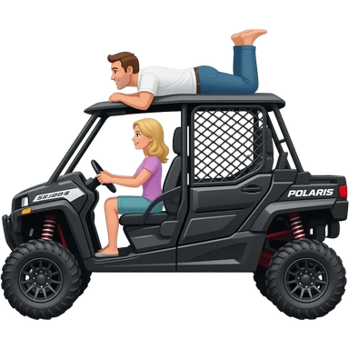 Black side view 4 door (instead of door use nets ) Polaris ranger sxs lifted super high with mom (blonde) and driving and dad laying on top of roof on his belly playing emoji