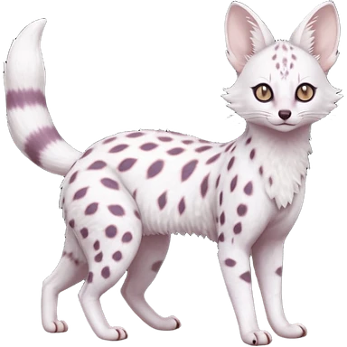 White Albino light whitish grey-spotted Serval-Civet-Genet-Trico-Furret-Linoone-Noibat-Espeon-Fakémon-Pokémon-animal-hybrid-fusion-creature (full body) with vibrant glowing eyes, cute, elegant, soft, realistic, pastel fur emoji