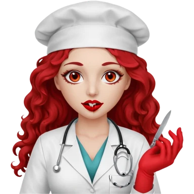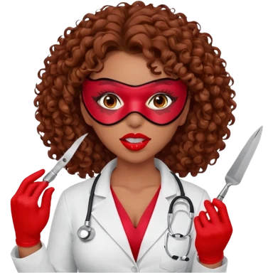 Lilith scalpel in hand, evil surgeon sexy surgeon clothes. She has red eyes. She brown long curly hair. Wears sexy doctor outfit with red gloves. Covers mouth necknose with red burka to hide her identity emoji