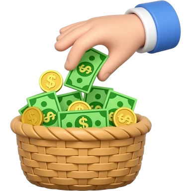3D emoji, hand throwing cash into a basket full of money, metallic silver textures, vibrant colors, isolated, high resolution. emoji