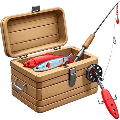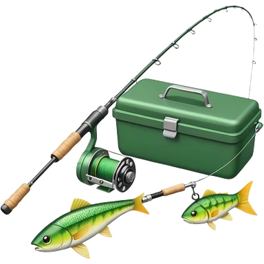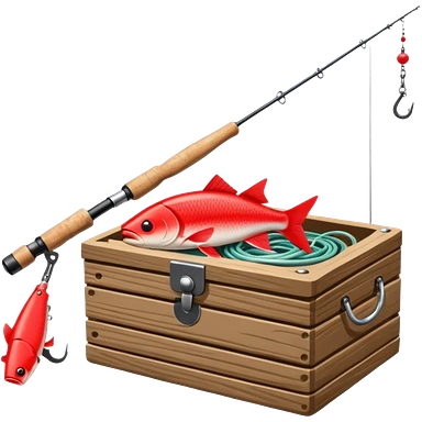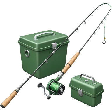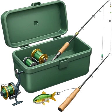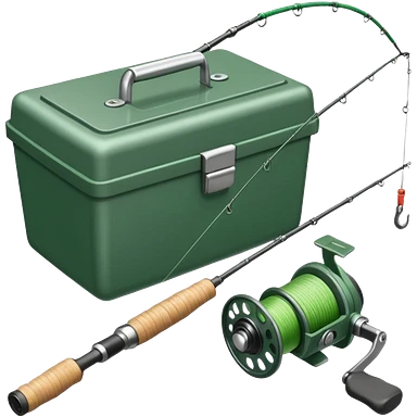 A fishing rod with reel and line neatly coiled beside a bait box. emoji