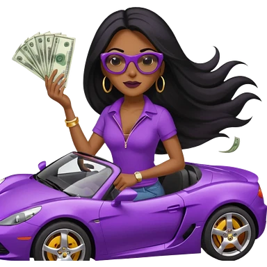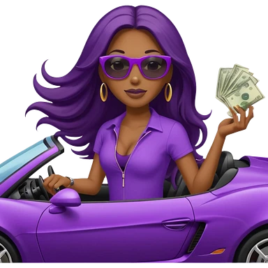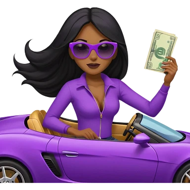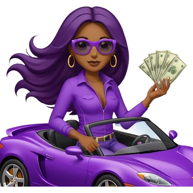 Black woman with long hair riding in a purple sports car with money falling emoji