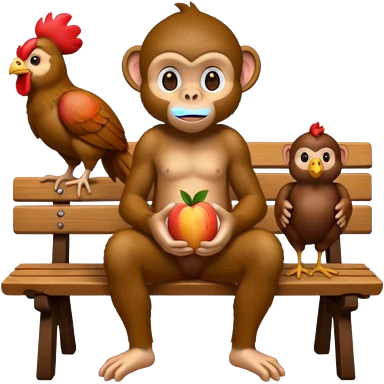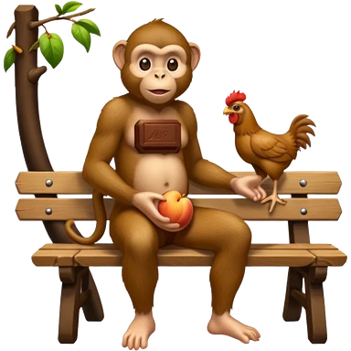 monkey(full body) sitting on a bench and eating peach and chocolate and chicken watches him emoji