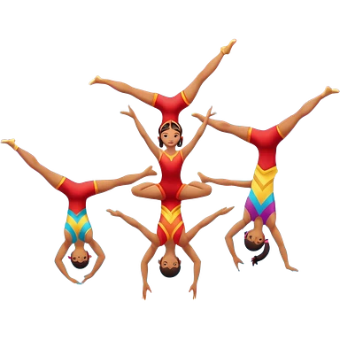 A group of acrobats performing a synchronized routine, balancing and flipping in mid-air. One acrobat is upside down while another supports them, with bright stage lighting illuminating their graceful movements against a colorful backdrop. The floor is padded for safety. emoji