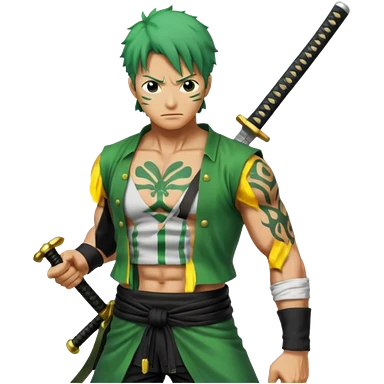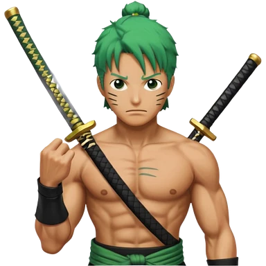 Haz que tenga una sonrisa epica una cicatriz en el ojo serrado y una espada entre los dientes y dos más a cada lado emoji