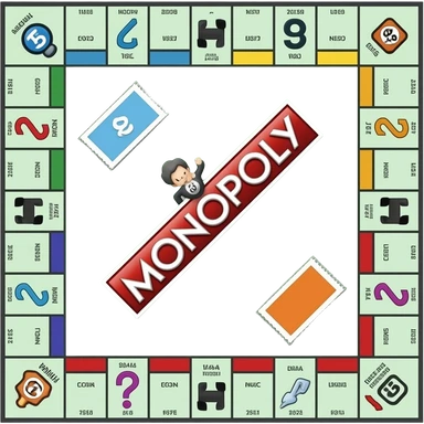 A photorealistic icon featuring a Monopoly board with property spaces, colorful game tokens, dice, and stacks of money. The design includes detailed textures of the board, cards, and tokens, capturing the essence of the Monopoly game. Transparent background, symbolizing Monopoly and board games. emoji