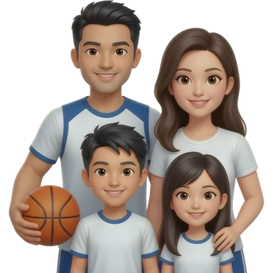 Asian Family of 4 w/ basketball (Dad w/ black & white hair, Mom w/ long hair, Son short hair, Daughter w/ long hair) emoji